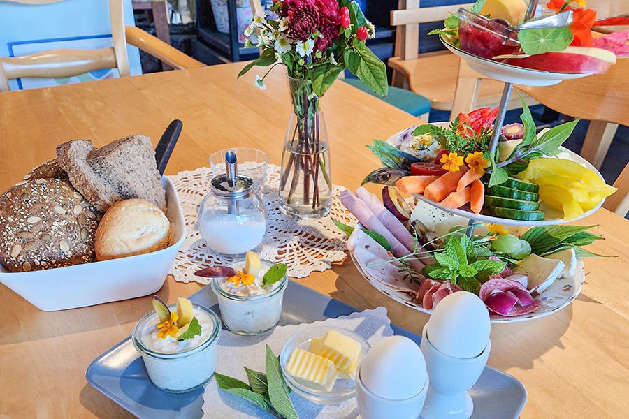 - Liebevoll angerichtetes Gärtnerfrühstück mit Blüten und Kräutern (auch vegetarisch)