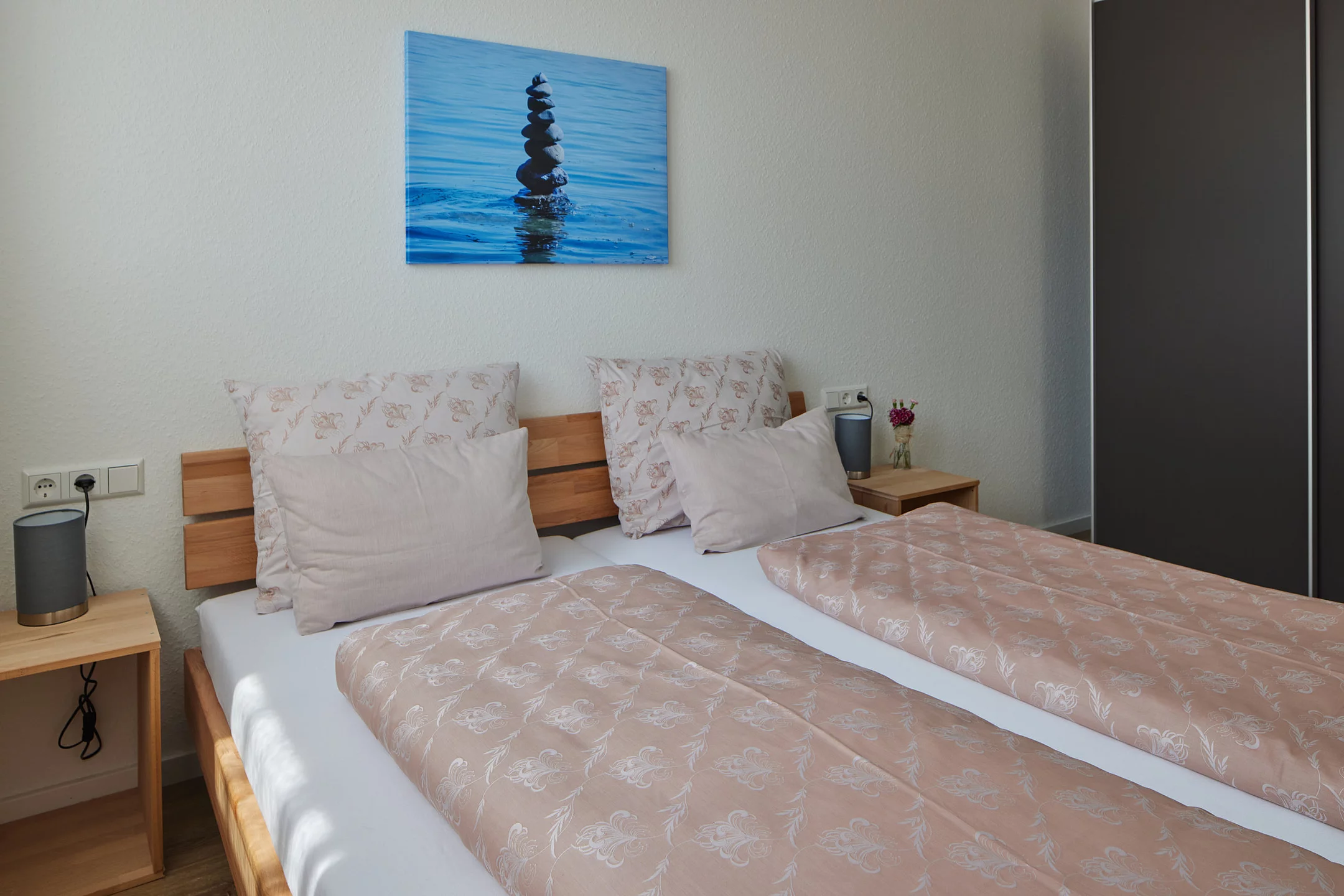 Die Ferienwohnung erstreckt sich über das erste Obergeschoss und das Dachgeschoss und bietet mit zwei separaten Schlafzimmern ausreichend Platz für erholsame Tage. Der offene Wohn- und Essbereich mit voll ausgestatteter Küche bildet den Mittelpunkt für gemeinsame Zeit. Der Balkon lädt dazu ein, den Tag entspannt ausklingen zu lassen.